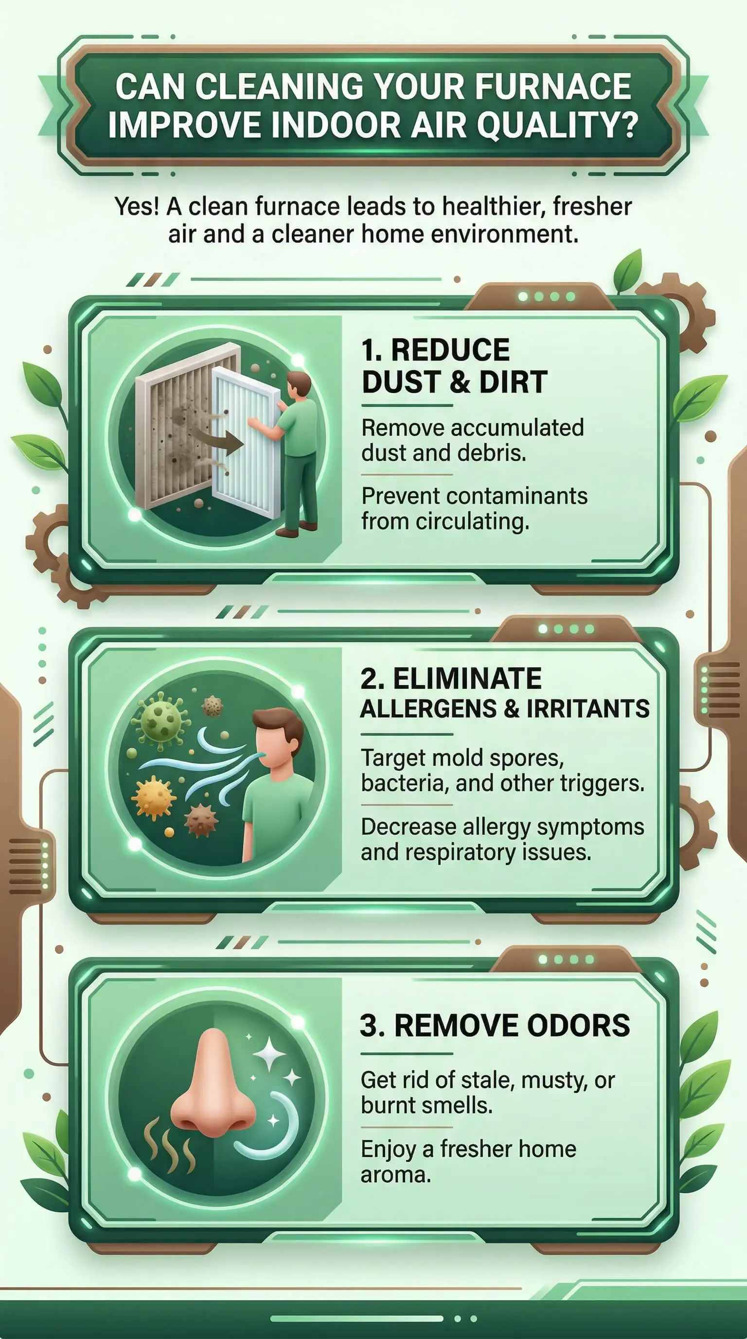 A: Yes — and more significantly than most homeowners expect. Across more than two million households, one observation holds consistently: indoor air quality problems rarely have a single cause, but a poorly maintained furnace is almost always part of the picture. A professionally cleaned furnace delivers four compounding improvements: