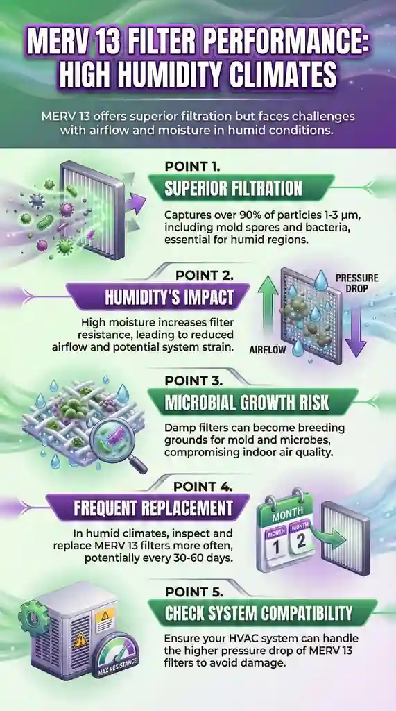 MERV 13 captures 85-90% of particles 1.0-3.0 microns but fails 40-60% faster in high humidity climates.